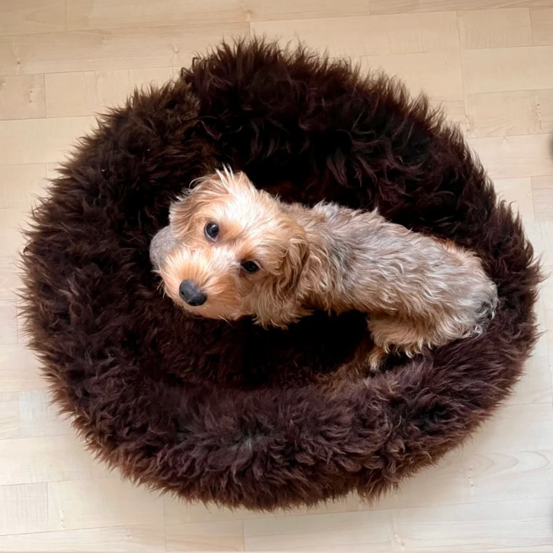 Helen Wells Sheep // Håndlavet donut hundseng i 100 % øko. fåreskind (brun)