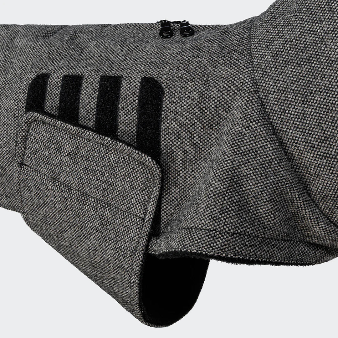 En varm og komfortabel vinterjakke til franske bulldogs med specialtilpasset pasform, foret med blød fleece og fremstillet i sort italiensk tweed. Stoffet er behandlet med en PU-membran med en vandsøjle på op til 3.000 mm, som giver god beskyttelse mod regn og fugt i hverdagen.