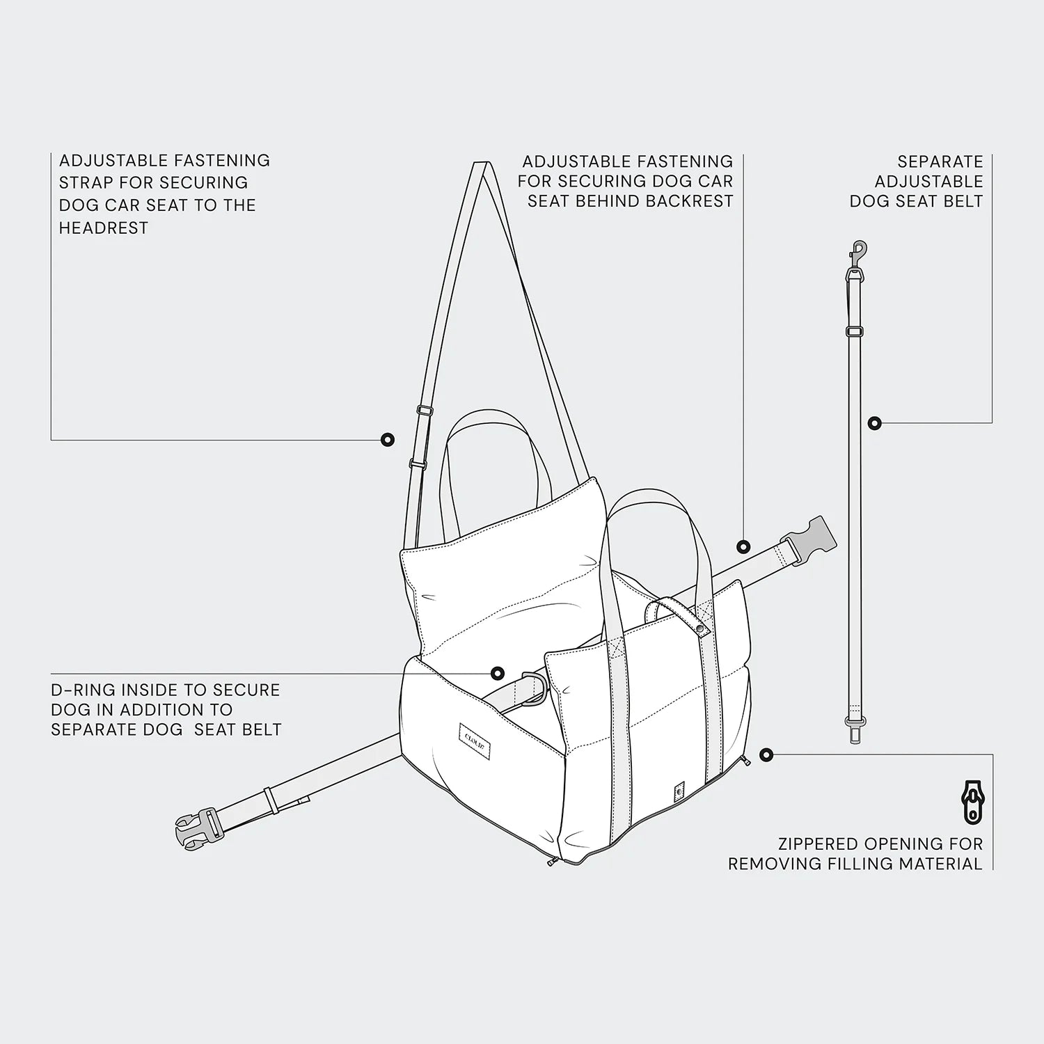 Et multifunktionelt bilsæde til hunde, der kombinerer sikkerhed, komfort og et stilrent design. Sædet kan både bruges i bilen og som praktisk transporttaske, så din hund har en tryg base på farten.