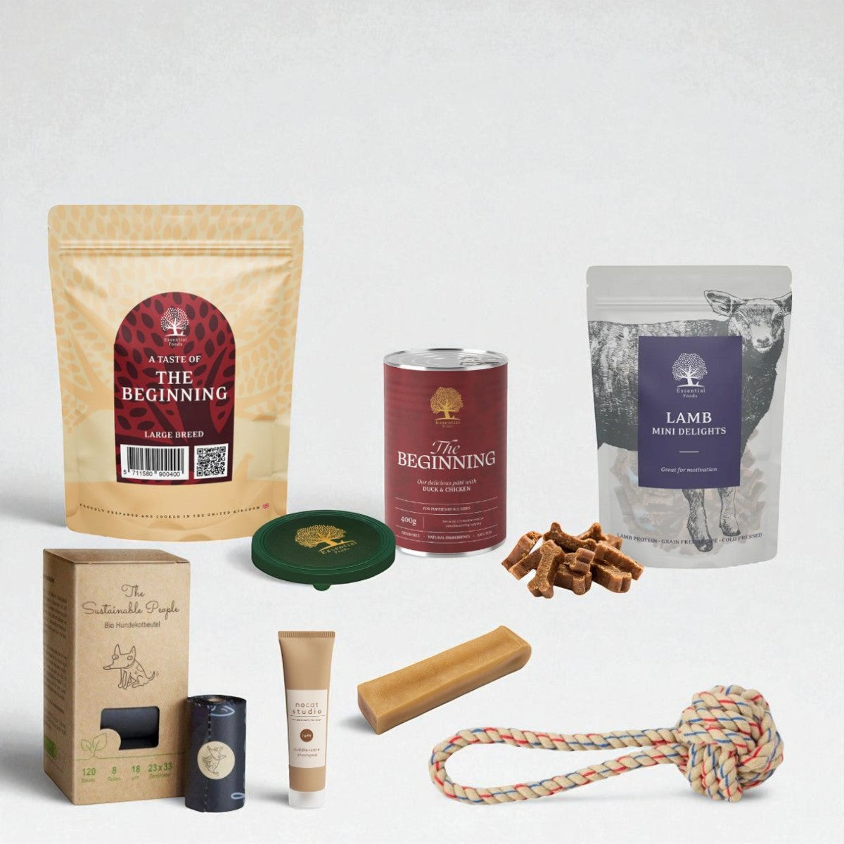 Im Paket enthalten sind ein Probiermenü Trockenfutter, nahrhaftes Nassfutter mit Deckel, weiche Leckerlis fürs Training, ein Kauknochen und ein robustes Seilspielzeug zum Spielen. Außerdem erhalten Sie ein mildes Shampoo für die erste Wäsche und biologisch abbaubare Hundebeutel, damit die Spaziergänge unkompliziert und umweltfreundlich verlaufen.