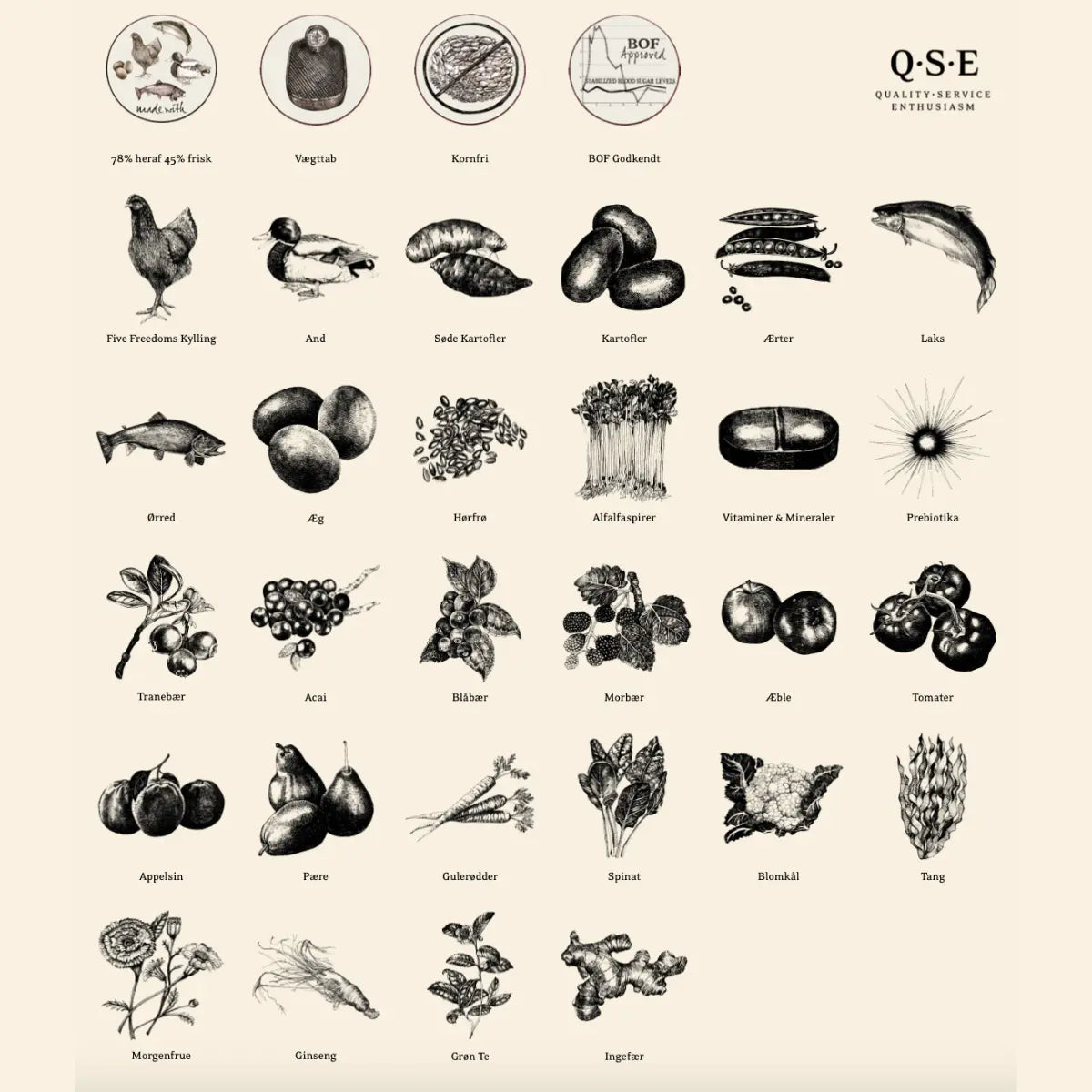 Frisches Huhn & Ente, getrocknetes Huhn & Ente, Süßkartoffel, Kartoffel, Erbsen, frischer Lachs & Forelle, frische ganze Eier, Leinsamen, Alfalfasprossen, Leberbrühe, Erbsenfasern, Vitamine & Mineralien, MOS (Mannan-Oligosaccharide), FOS (Fructooligosaccharide), Glucosamin, Chondroitin, MSM (Methylsulfonylmethan), Cranberry, Acai, Blaubeere, Maulbeere, Apfel, Tomate, Orange, Birne, Karotte, Spinat, Blumenkohl, Seetang, Ringelblume, Ginseng, grüner Tee, Ingwer.