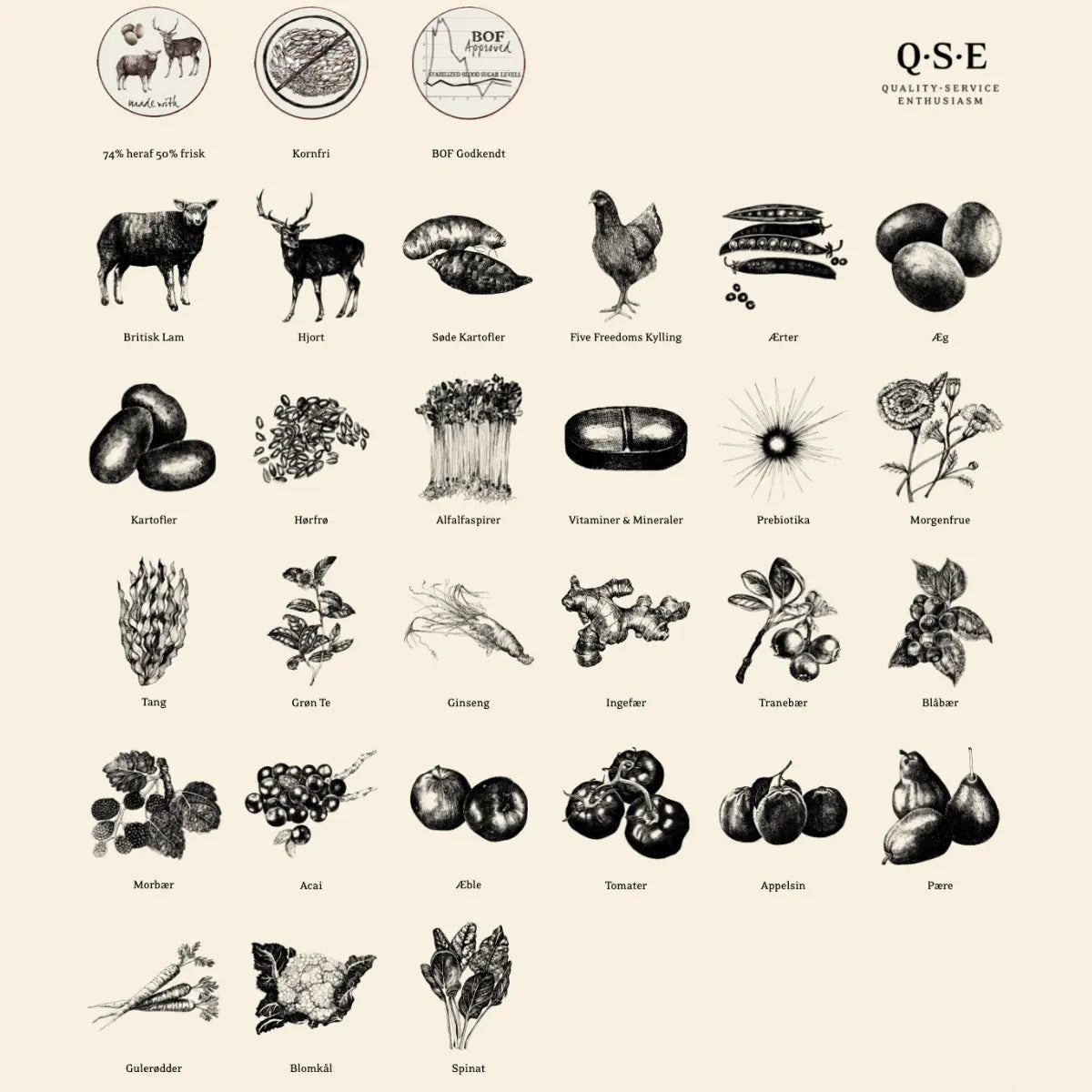 Frisches Lamm- und Wildfleisch, Süßkartoffel, getrocknetes Lammfleisch, Erbsen, frische ganze Eier, getrocknetes Hühnchen, Kartoffeln, Leinsamen, Lammfett, Alfalfasprossen, Leberbrühe, Vitamine und Mineralien, MOS (Mannan-Oligosaccharide), FOS (Fructooligosaccharide), Glucosamin, Chondroitin, MSM (Methylsulfonylmethan), Cranberry, Acai, Blaubeeren, Maulbeeren, Apfel, Tomate, Orange, Birne, Karotte, Spinat, Blumenkohl, Seetang, Ringelblume, Ginseng, grüner Tee, Ingwer.