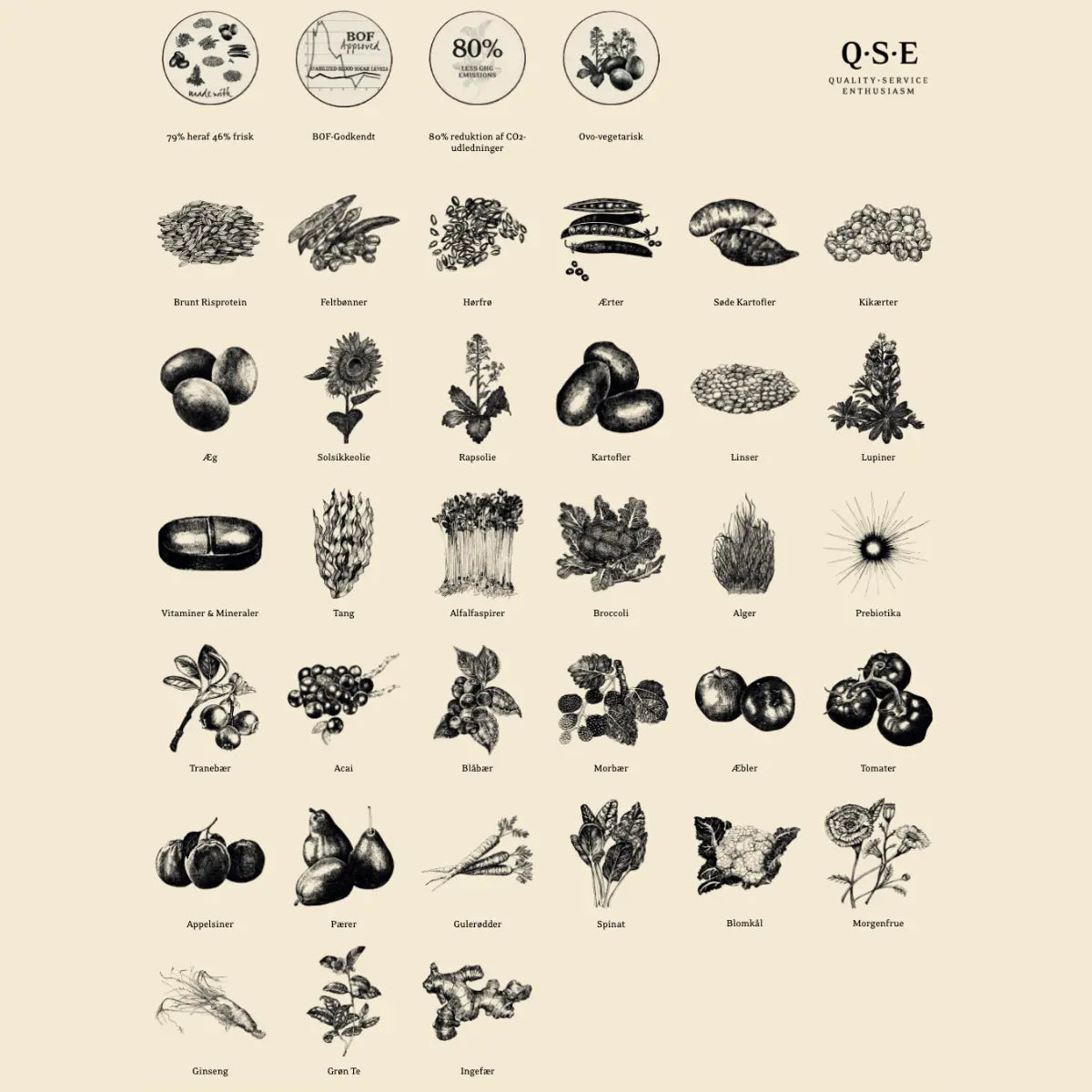 Braunes Reisprotein, Ackerbohnen, Leinsamen, Erbsen, Erbsenprotein, Süßkartoffel, Kichererbsen, getrocknete Vollei, Sonnenblumenöl, Rapsöl, Bierhefe, Kartoffelprotein, frisch zubereitete Eier aus Freilandhaltung, Linsen, Lupinen, Mineralstoffe, getrocknete Algen, Kartoffeln, Gemüsebrühe, Luzerne, getrockneter Brokkoli, getrocknete Algen, MOS (Mannan-Oligosaccharide), FOS (Fructooligosaccharide), Cranberry, Acai, europäische Heidelbeeren, Maulbeere, Apfel, Tomate, Orange, Birne, Karotte, Spinat, Blumenkohl, Ringelblume, Ginseng, grüner Tee, Ingwer.