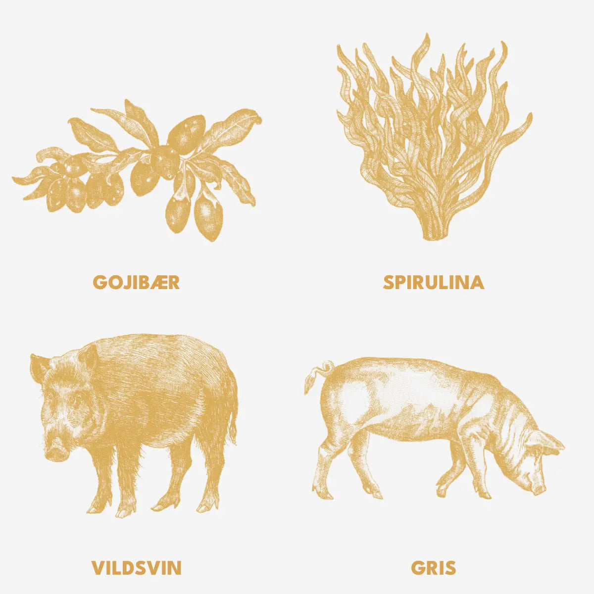 Wildschweinfleisch (26 %), Schweineherz (20 %), Schweineluftröhre (19 %), Erbsenmehl (2 %), Cranberries (1 %), Heidelbeeren (1 %), Goji-Beeren (1 %), Brombeeren (1 %), Lignocellulose, Calciumcarbonat, Seetang (0,2 %), grüner Tee (0,2 %), Ringelblume (0,2 %), Ingwer (0,2 %), Spirulina (0,2 %).