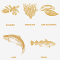 Lachs (35 %), Kabeljau (30 %), Süßkartoffeln (2 %), Erbsenmehl (2 %), Lachsöl 1 %, Cranberries (1 %), Heidelbeeren (1 %), Goji-Beeren (1 %), Brombeeren (1 %), Lignocellulose, Calciumcarbonat, Seetang (0,2 %), grüner Tee (0,2 %), Ringelblume (0,2 %), Ingwer (0,2 %), Spirulina (0,2 %).