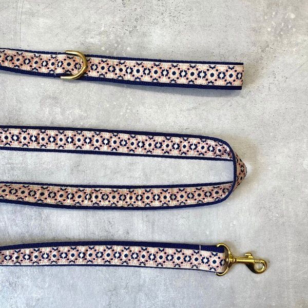 Eine schöne und schlichte Hundeleine mit Mosaikblumen in Dunkelblau- und Rosatönen. Die Hundeleine ist Teil unserer eigenen Hunni-Kollektion, die in limitierter Auflage erhältlich ist und daher nur in begrenzter Stückzahl erhältlich ist.