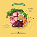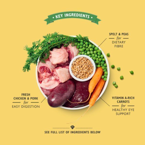 Eine köstliche und vollwertige Mahlzeit aus gesunden Bio-Zutaten: Huhn, Schwein, Rind und Fisch, gemischt mit Karotten, Erbsen und gesunden Kräutern. Nassfutter, das alle Ernährungsbedürfnisse von Hunden ab 4 Monaten erfüllt.