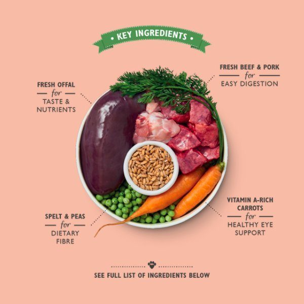 Bio-Nassfutter für Ihren vierbeinigen Liebling – hergestellt aus frischem Rind-, Hühner- und Schweinefleisch, Gemüse, Dinkel und Kräutern. Eine herzhafte und leckere Mahlzeit, die alle Ernährungsbedürfnisse von Hunden ab 4 Monaten erfüllt.