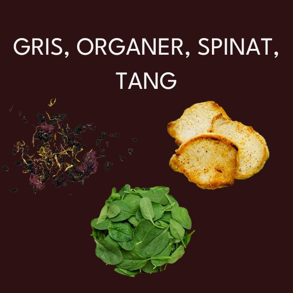 Zutaten: Schweinefleisch (80%) (Fleisch und Innereien), Spinat (5%), Seetang (1%), Wasser, Schweinegelatine, Vitamine und Mineralstoffe