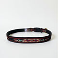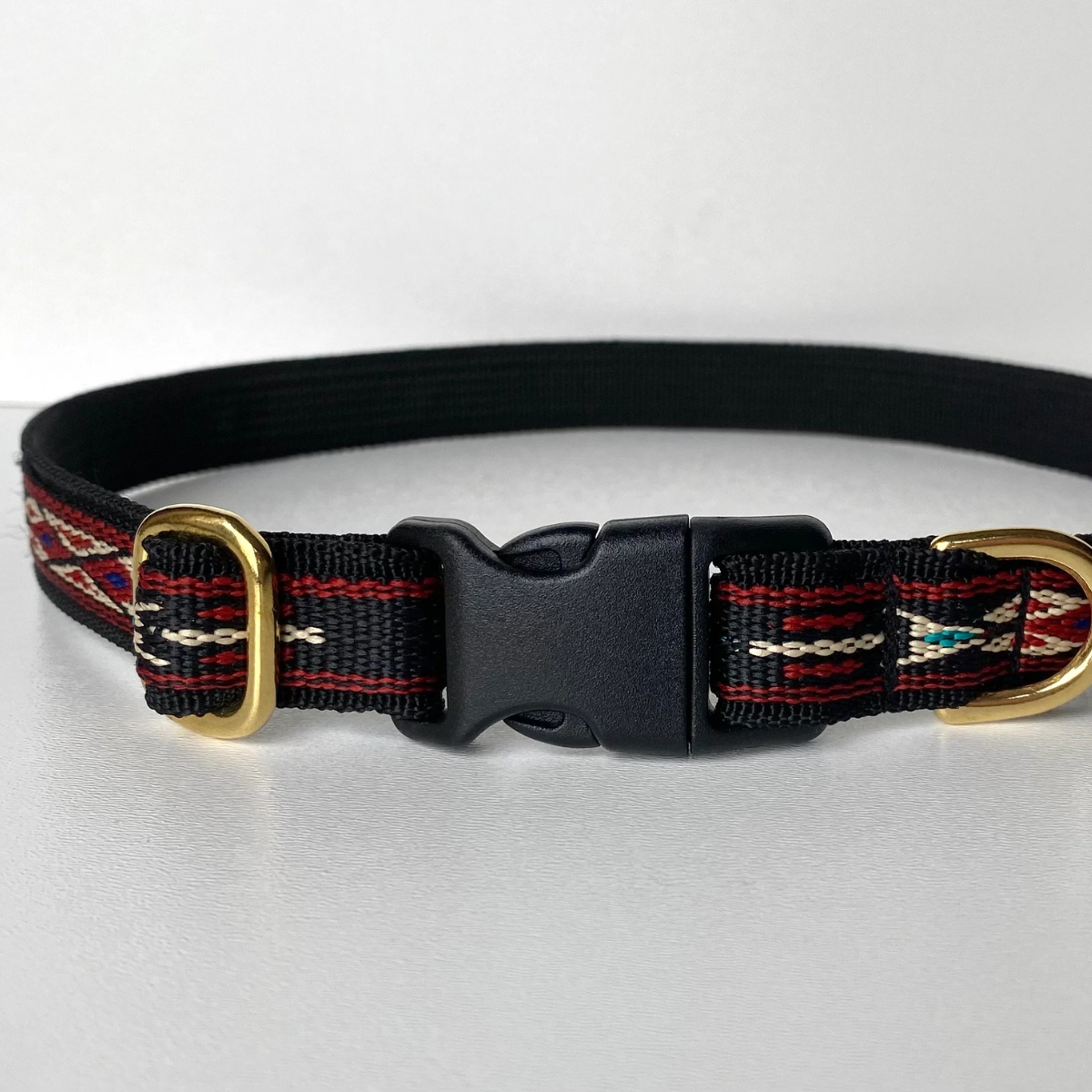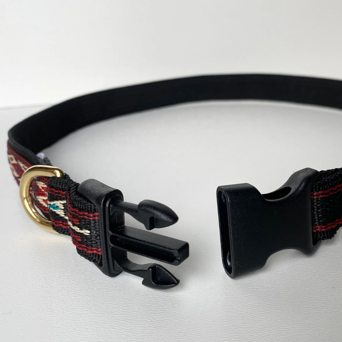 Ein wunderschönes und einzigartiges Halsband für kleine und mittelgroße Hunde. Das Halsband ist in einem dekorativen Bohème-Muster gewebt und mit Messingringen, einer verstellbaren Schnalle und einer praktischen Klickschnalle aus schwarzem Kunststoff ausgestattet.
