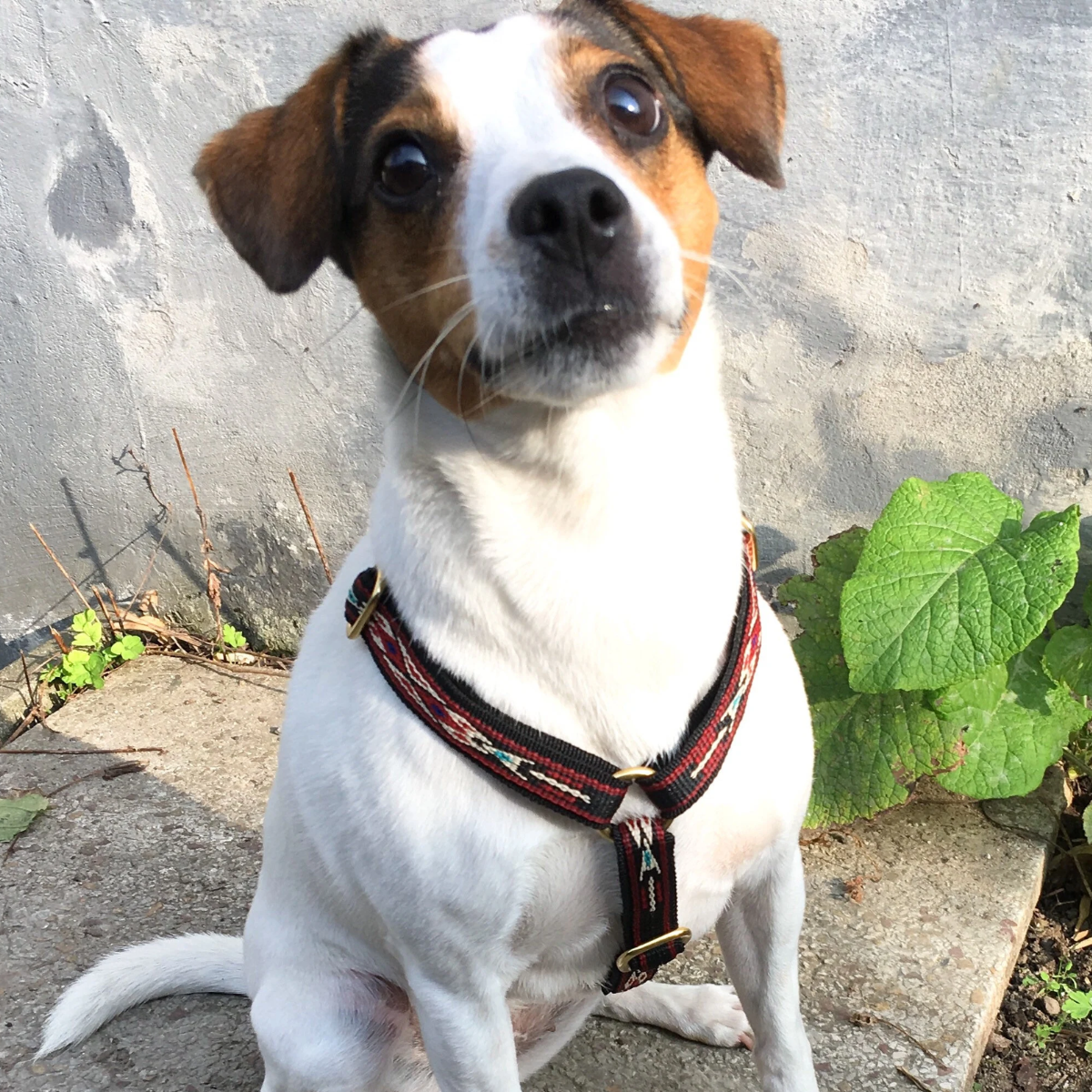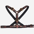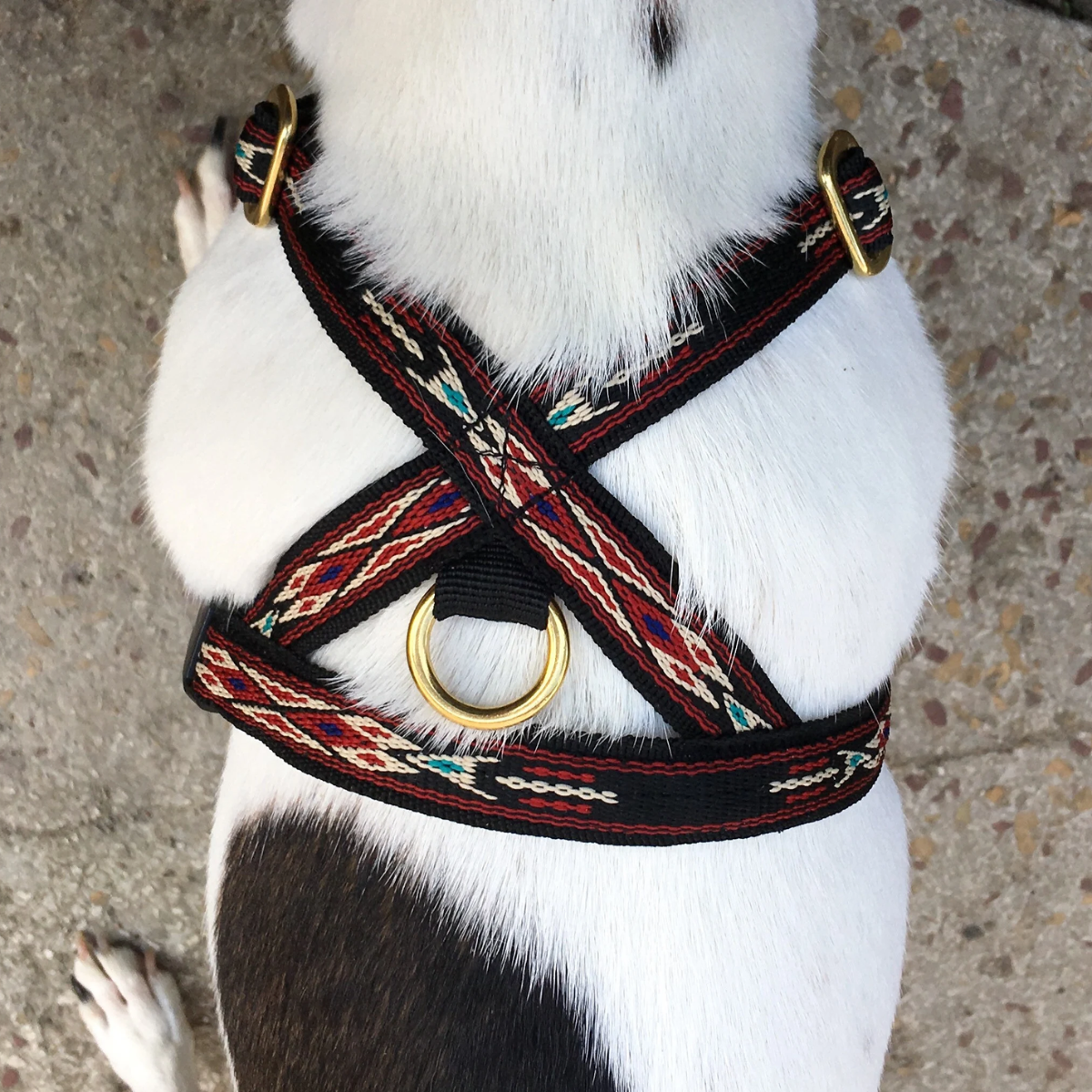 Das perfekte Geschirr, bei dem Passform und Design im Vordergrund stehen. Das Geschirr besteht aus gewebten 12 mm breiten Riemen und ist sowohl vorne als auch hinter den Vorderbeinen und zwischen den Beinen verstellbar. Kleine Messingringe, Verstellschnallen und ein Klickverschluss aus schwarzem Kunststoff machen das Geschirr ultraleicht. Die V-Form an der Vorderseite ermöglicht dem Hund freie Schulterbewegung und verhindert, dass das Geschirr am Hals spannt.