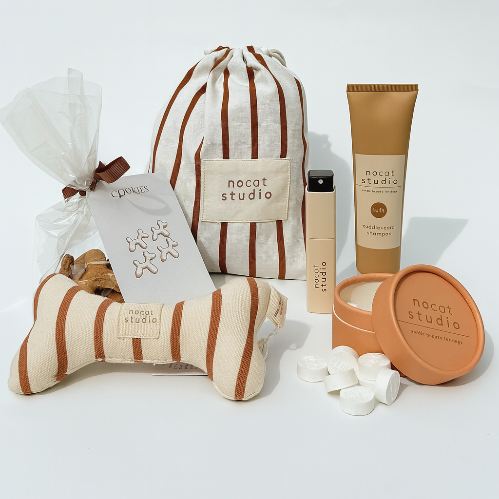 Das Holiday Kit von Nocat Studio ist eine praktische Baumwolltasche gefüllt mit kleinen Lieblingsstücken für Sie und Ihren Hund – perfekt für den Urlaub, Wochenendtrips oder als Geschenk.