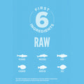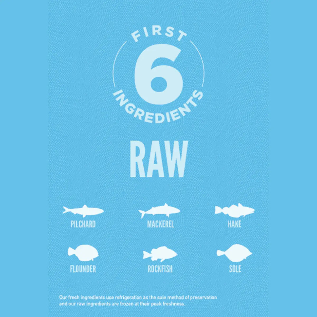 Rohe ganze Sardine (18 %), rohe ganze Makrele (11 %), roher ganzer Seehecht (10 %), rohe Flunder (6 %), roher ganzer Rotbarsch (6 %), rohe ganze Seezunge (6 %), getrocknete Makrele (5 %), getrockneter Hering (5 %), getrockneter Weißfisch (5 %), dehydrierte Sardine (5 %), dehydrierter Blauer Wittling (4 %), Heringsöl (4 %), ganze rote Linsen, ganze Erbsen, ganze Kichererbsen, ganze grüne Linsen, Linsenfasern, ganze Pintobohnen, Erbsenstärke, Sonnenblumenöl, getrockneter Seetang, frischer ganzer Kürbis, frischer ganzer Butternusskürbis, frische ganze Zucchini, frische ganze Karotten, frische ganze Äpfel, frische ganze Birnen, getrocknete Zichorienwurzeln, frischer Grünkohl, frischer Spinat, frische Mangoldblätter, frische Rübstielblätter, ganze Cranberries, ganze Heidelbeeren, ganze Saskatoon-Beeren, Kurkuma, Mariendistel, Klettenwurzel, Lavendel, Eibischwurzel, Hagebutten.