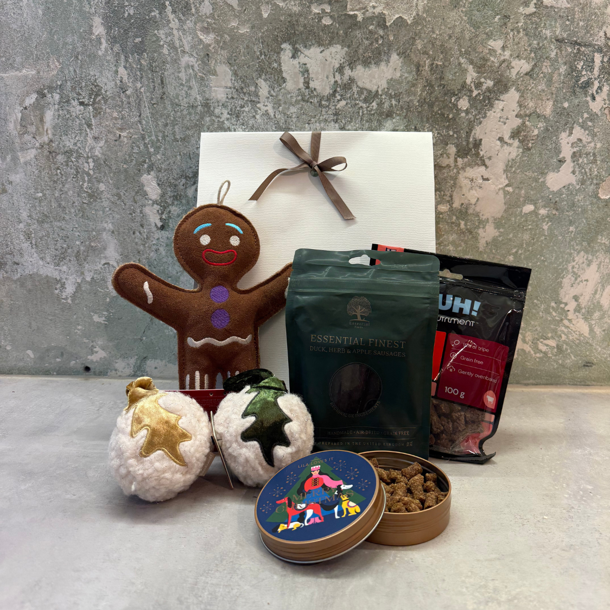 En julegavepose fyldt med smag, leg og julelogrende haler. Vi har samlet nogle af vores absolutte favoritter i juletiden, så du kan forkæle din hund med både lækre godbidder og sjovt julelegetøj. Perfekt under træet, som adventsgaver eller hvis du blot vil gøre et godt tilbud.