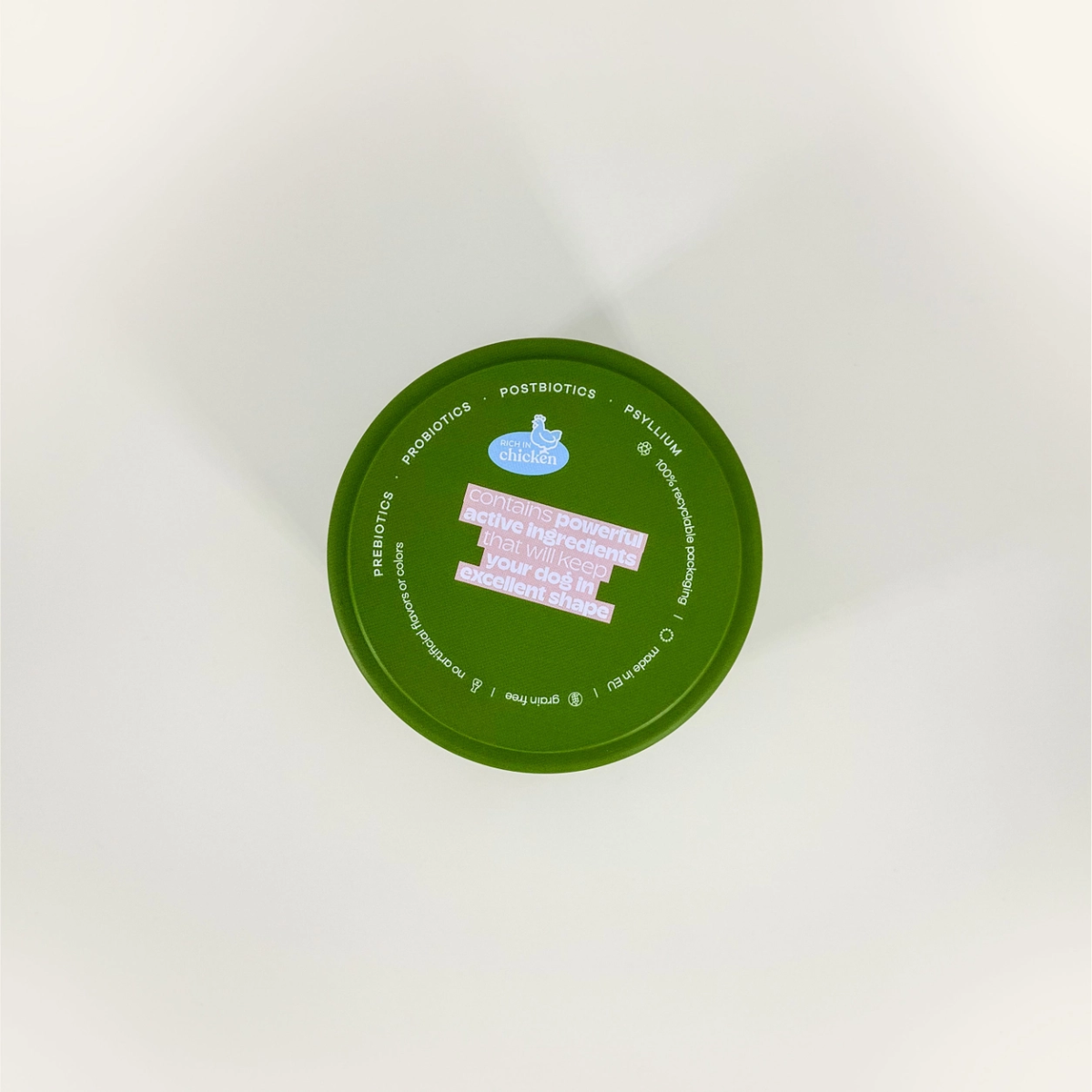 Kartoffel, kylling (22 %), glycerin, ærtemel, gær og gærdele (166,9 mg), vegetabilsk olie, cikorerodspulver, calcium, psyllium (18,8 mg), pektin (11,3 mg), akaciepulver (9,4 mg), Lactobacillus helveticus (1,125 × 10⁹ CFU).