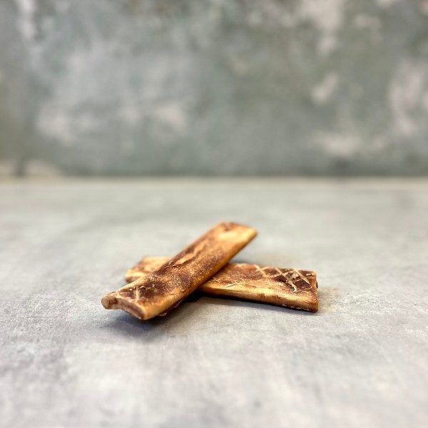 Gelatine ist eine Art Knochenbrühe. Je dicker die Gelatine, desto konzentrierter sind die Nährstoffe. Gelatine kann außerdem dazu beitragen, die Darmbarriere zu versiegeln und Proteine und Fette aus der Nahrung abzubauen. Der zähe Snack ist reich an Nährstoffen und sehr leicht verdaulich. Daher ist Gelatine auch eine gute Alternative zu Rohhaut (die Haut enthält), da sie leichter verdaulich ist.
